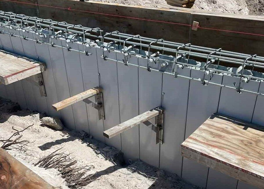 The Truline system's strength is provided through the steel rebar and concrete inside of the Truline form. Depending on the engineering design, either 1 rebar, 2 rebars or 4 rebars will be required, unless the installation is pin piled. Building the rebar form work is standard. Truline offers two accessories to help locate the rebars inside the Truline forms as shown below.